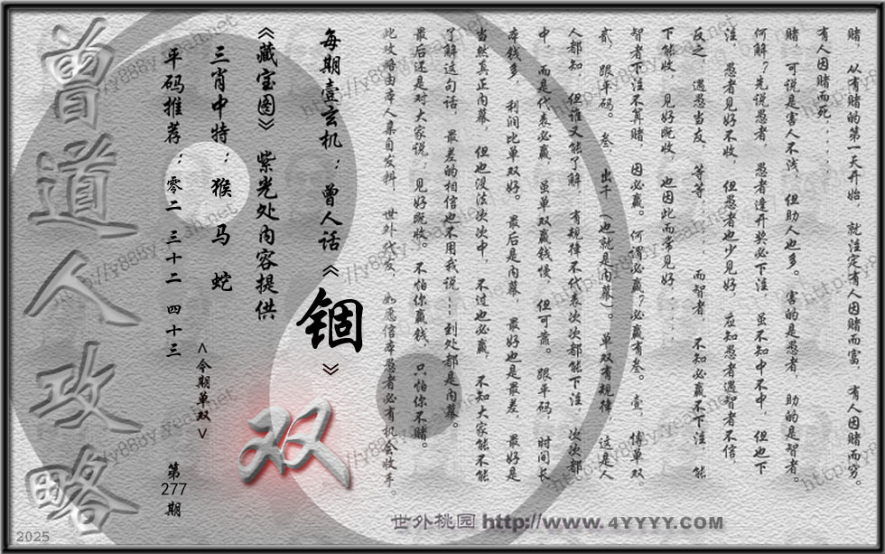 277期:藏寶圖 新:遥想兔园今日会 老:为问边庭更何事 禁:羊 禁:4尾 玄機字:《锢》
